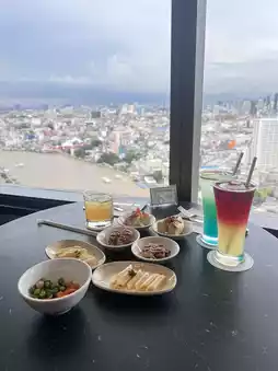 Located on the 31st floor of the Millennium Hilton Hotel, this rooftop bar offers panoramic views of Bangkok with nothing blocking the scenery. The atmosphere is very romantic. Unfortunately, we missed the sunset, which would have been stunning. We enjoyed sipping cocktails, listening to music, and taking lots of photos. Don’t miss the cool spot at the helicopter landing pad—such a trendy corner.