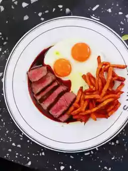 Served with a runny sunny-side-up egg, adding moisture to the beef