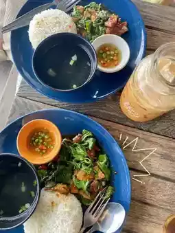 Hua Takhe Intersection Cafe and Guesthouse ‼️🏬🐱 This is a homey riverside cafe located in the old Hua Takhe market. It serves as both a cafe and accommodation for tourists, giving a nostalgic feeling like going back to childhood while enjoying the chill atmosphere by the water. They offer savory dishes, desserts, and drinks. I went with two friends, and here’s the food cost: - Crispy pork basil for 80 THB per plate (a bit pricey, but the taste is quite good) - Thai iced tea 45 THB - Coke 15 THB - Plain ice 2 THB per glass The atmosphere is really nice. If you like to relax and chill, I think this place is quite interesting because I ended up sitting so long I didn’t want to leave 😅 Don’t miss out on the comfortable atmosphere.