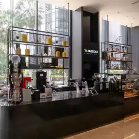 A cafe and bar in the Asoke area serving drinks, bakery items, and various light bites ~ The shop is located on the 1st floor of the Carlton Sukhumvit Hotel. It is decorated in a cool black tone with a luxurious feel from the hotel’s interior design. There are seating options both indoors and in an outdoor corner.