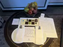 Open the door to find a "handwritten welcome letter" ✍️ (personally by Ross!), a colorful tropical fruit platter, and an artisanal chocolate plate 🍫. Detail lovers rejoice: knives and forks wrapped in pristine white napkins, even a "Bangkok Food Guide" ready for you—pampering your senses from the very start.