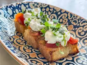 - Bruschetta: crispy focaccia bread topped with fragrant cheese, tomatoes, and pesto