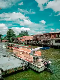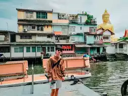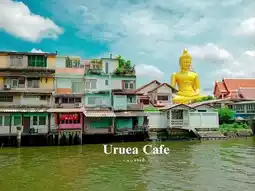 Uruea Cafe, Soi Phetkasem 15, highlights include a view of the large Buddha statue from Wat Paknam Phasi Charoen. The atmosphere is nice with a good view, next to a canal with boats passing by. It is a photo spot for the large Buddha statue of Wat Paknam Phasi Charoen. There are two seating zones: indoor air-conditioned rooms and outdoor open-air seating. Food and drinks are available.