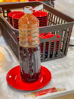 Drinks include soft drinks, Slurpee, chrysanthemum tea, fruit juice, tea, and water with ice available for refills.