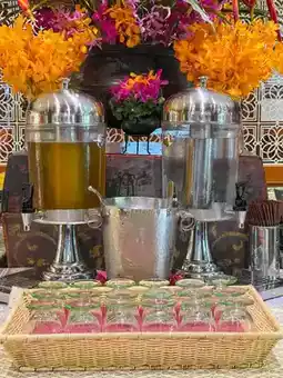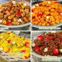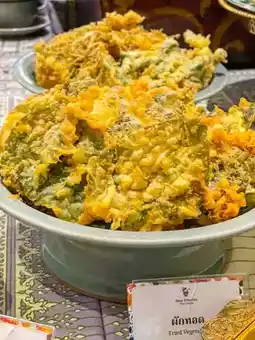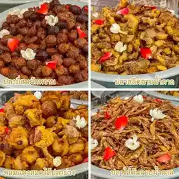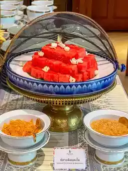 The buffet line also includes Thai dishes such as two-color papaya salad, pomelo salad, glass dragon, seasoned pork, sun-dried pork, sticky rice, mango with sweet fish sauce, and dried fish with watermelon.