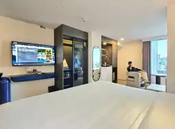 A “bright but not chaotic” stay really exists. This place is not just a “bed” but a “creative space” full of fun, vibrant designs, featuring unique furniture, bold colors, and complete amenities including a city-view swimming pool, restaurant, fitness center, and a 24-hour coffee shop.
