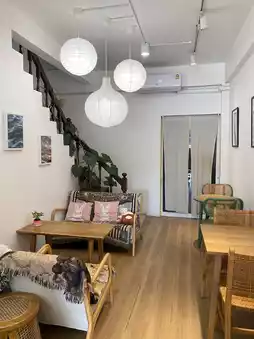 It’s a small 2–3 story coffee shop decorated in a warm minimalist style with soothing green tones, LED lights, and cool printed artwork. Perfect for art lovers and content creators who enjoy taking stylish photos.