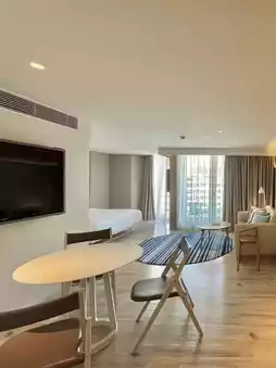 I booked a studio room, the basic room here, but was upgraded two levels to a deluxe corner room, which is a spacious and beautiful corner room with well-arranged furniture and a balcony. The bathroom is very spacious with a large bathtub, very comfortable.