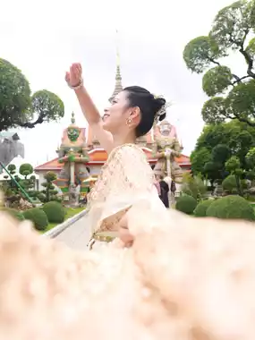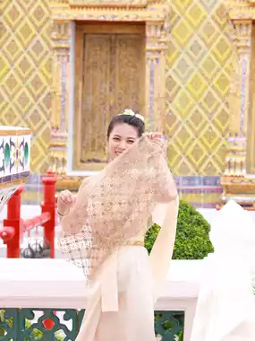 When you come to Thailand, try wearing a Thai costume. There are many Thai costume shops around the King Rama Temple to choose from. We walked out from the back and randomly picked one, without a photographer. The Thai costume costs 150 baht, hairstyling 50 baht, and a photographer for one hour for two people costs 1,000 baht. The photographer will give you all the photos taken. Photos taken by yourself and by a photographer are completely different; the photographer makes you look absolutely stunning!!!