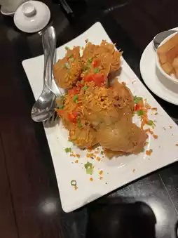 • Crispy prawns with wasabi salad dressing: crispy fried prawns tossed in wasabi cream salad, sweet and spicy balanced, considered a signature dish
