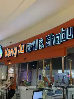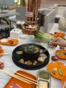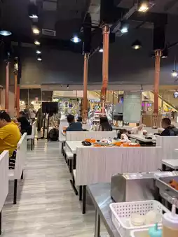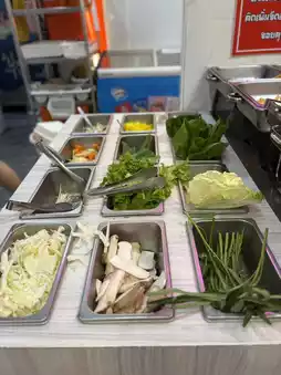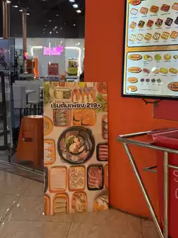 This is a Korean BBQ restaurant located on the 2nd floor of Major Ratchayothin. Prices start at 219+ net, including drinks, averaging 276 per person. The restaurant offers a variety of menu items, including pork, beef, chicken, shrimp, salmon, as well as fried dishes and snacks like fried chicken, nuggets, refillable drinks, fresh vegetables, and dessert options such as ice cream in flavors like strawberry, lemon, and chocolate.