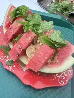 Signature Dish: Watermelon Salad - A perfect pairing of juicy, sweet watermelon with a zesty Isaan-style dressing. Available in two versions: fermented fish sauce or regular fish sauce, mixed with fresh chili, lime, and shallots. The result is a sweet, cool, spicy, and tangy flavor with a refreshing twist from passion fruit, making it an extraordinary dish you'll want to revisit.