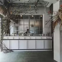• The upper floor is the café zone with wooden furniture, warm tones, and flowers in every corner