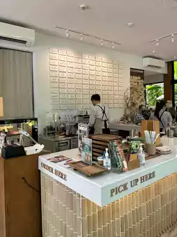 Inside the shop, the color scheme is white and brown with glass all around, offering views that match the tree-filled surroundings. Outside the shop, there is also a seating area and a small garden where people can walk or take photos.