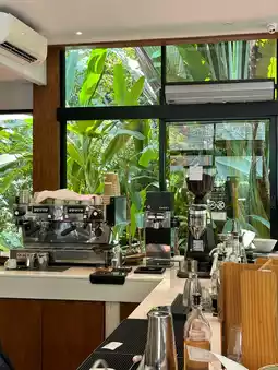 A healing café with a natural feel and a very lush atmosphere surrounded by trees. The decoration is simple but very stylish. Most importantly, their drinks and desserts are delicious, and the coffee is organic from the shop itself. This place is called MiVana Coffee Flagship Store or Mivana Coffee.