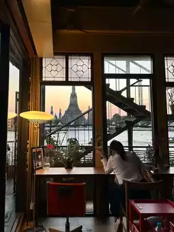 Don't miss it if you're looking for a cafe with good vibes to watch the sunset along with the view of Wat Arun. Nong Nok Yoong highly recommends this cafe. The light around 5 PM is absolutely beautiful.