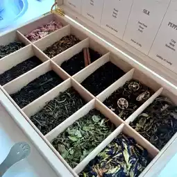 Alongside premium tea, elegant savory items and vibrant sweets are served.