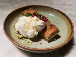 The baklava here is truly outstanding. Thin, crispy filo pastry layered beautifully, with a crunchy exterior. The filling between the layers is made from mixed nuts (mostly pistachios), mixed with sweet honey and lightly flavored with cinnamon. Baked fresh and served warm, paired with smooth, creamy, sweet and tangy Greek yogurt ice cream drizzled with honey, making it even more delicious. This is one of the best baklavas in the country.
