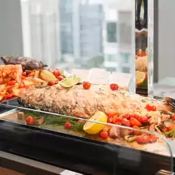 🍝 Fresh pasta cooked to order 🧀 Cheese board with a large selection of cheeses, fresh seafood including shrimp, big crab claws, oysters served with spicy seafood sauce. Dessert lovers will adore the delicious dessert and bakery menu, especially the Choux Cream Banoffee with ice cream clouds from a famous shop in Chonburi.
