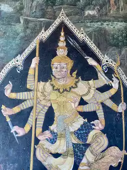 - The golden chedis and Ramayana murals that wrap around the temple