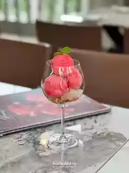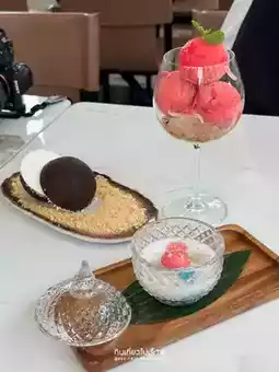 The recommended menu is the Coconut Mousse Cake, which looks like a small coconut but has a brown outer shell made of chocolate. The inside coconut flesh is a coconut chiffon cake. It’s delicious and a great idea. Other menu items include Dahla Delight ice cream in a reddish-pink color and Khanom Ko, a fragrant and creamy coconut milk dessert.