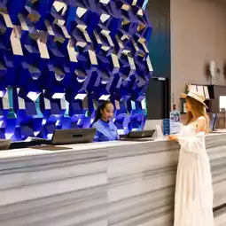 Come relax at a hotel in the heart of Siam next to the BTS Skytrain, perfect for shopping and convenient travel. Holiday Inn Express Bangkok Siam offers a great location ideal for those who love exploring the city with nearby attractions and shopping centers, close to department stores and art galleries. The rooms are beautifully designed with a comfortable blue-toned city and stadium view, fully equipped with amenities including a coin-operated laundry area, 24-hour fitness center, and a green garden for pleasant walks and beautiful photo opportunities. Enjoy a full breakfast line and a spectacular view of the BTS trains running by. There is also a C.P.S Coffee Mobile Store in front of the hotel where you can relax with a drink, plus currency exchange machines and ATMs right at the hotel entrance.