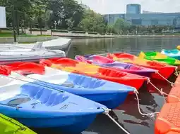 At Benjakitti Park, there are water activities including free pedal boating and kayaking sessions, each lasting 1 hour. The activity service point is not far from the Queen Sirikit National Convention Center, making it easy to get there. First, we head to the life jacket service point. The staff there are very friendly and approachable. If you have any questions about the activities, you can ask right at this spot.