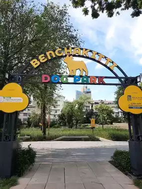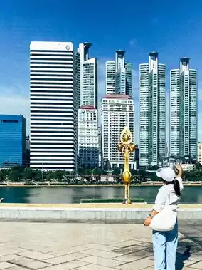 Benjakitti Park is a large public park in the heart of Bangkok. Besides being a popular exercise spot, the park is also perfect for picnics, relaxing, and enjoying the beauty of nature. It features large trees, beautiful gardens, and a natural ecosystem to explore. Most importantly, there are plenty of stunning photo spots! There is a nature-viewing bridge that contrasts with the high-rise buildings. The spot we photographed is the Golden Champa tree area, which has bright golden-yellow leaves and is incredibly beautiful. We were quite excited about this spot because it gives off a vibe similar to Korea or Japan ☘️🍂