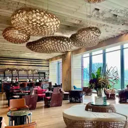 The modern interior and cozy lighting create a sophisticated ambiance, perfect for chatting with friends or a date.