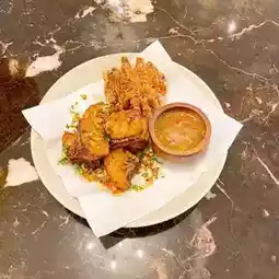 🐟 Fried sea bass with turmeric and fried shallots (250.-) Boneless sea bass, served with fried shallots and spicy seafood sauce.