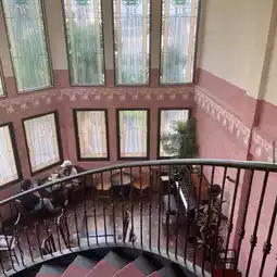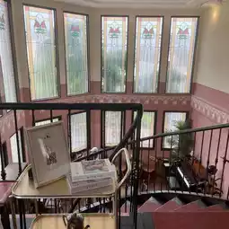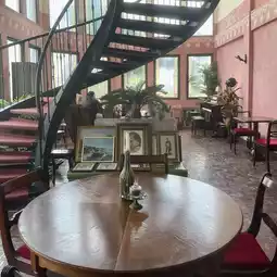 The Art Nouveau-style interior, reminiscent of a small art museum, is striking, with a warm pink-to-brown space dotted with antique furniture and a spiral staircase. It’s a cafe where you can lose track of time.