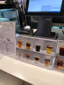 The flavor is a mildly sweet chocolate with bits of orange pulp that you can chew. Inside the shop, there is a counter where you order and then move on, but there are also seats on the left side for people to wait.