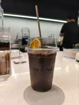 Orange X Chocolate, priced at 75 baht. We chose the regular sweetness level. First, I have to say that I usually don’t like sweet drinks, and the regular sweetness at ONE TO TWO Coffee (1:2) is just the right amount of mild sweetness.