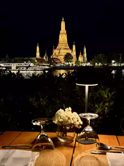 •Wat Arun at sunset from the opposite riverbank