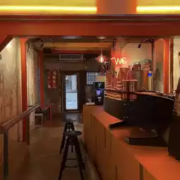The small interior is bathed in red light, creating a calm atmosphere where locals and travelers naturally mingle.