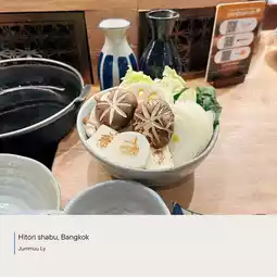 Hitori Shabu is an authentic Japanese-style single hot pot restaurant, featuring the concept of "delicious alone," giving you the freedom to choose from a variety of premium broths and meats such as Wagyu beef, Charolais beef, or Kurobuta pork. All ingredients are fresh and served with a set of vegetables and special side dishes like abalone, lotus root, and mushrooms. The broth options include clear soup, Hitori Kombu, Tonkatsu, and truffle soup, all freshly prepared right in front of you.