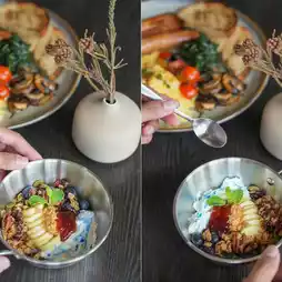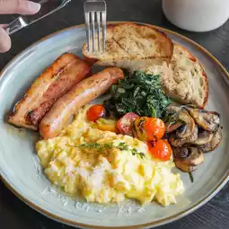 🍳 TIMO's Rustic Brekkie is another grand breakfast dish that includes creamy scrambled eggs, fragrant chunky smoked bacon, flavorful Italian sausage, sautéed spinach and mushrooms, colorful mixed cherry tomatoes, and chewy rye sourdough bread. It’s all complete in one plate, truly delicious from the first bite to the last.