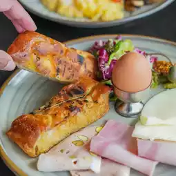 🍳 TIMO's Deli Brekkie is a full breakfast with soft-boiled eggs, pistachio mortadella, prosciutto cotto, provolone cheese, and fresh salad served with soft focaccia bread and delightful sides. I can say a good day starts with this plate.
