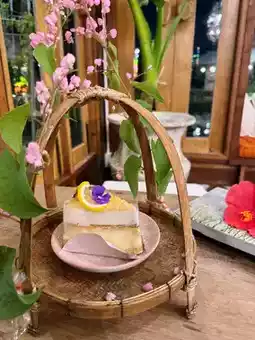 ✨ A Lanna-style café decorated with wooden materials and bamboo arches, creating a warm atmosphere like chilling in the North.