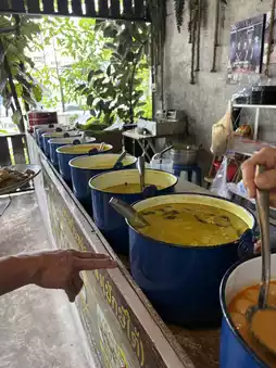 Kanom Jeen Mor Pleng is a shop with a special Kanom Jeen recipe, offering a variety of sauces to choose from. There is a buffet of many types of vegetables available for free self-service. The fried chicken is very crispy and delicious. They also have fried dishes and other menu items like shrimp paste fried rice and fried rice. The shop serves a generous amount of Kanom Jeen with sauce, very filling, affordable, and tasty. There are also dessert options with shaved ice served in large portions. The atmosphere is chill, suitable for both lunch and a mid-morning to afternoon stop. Come and try it out!