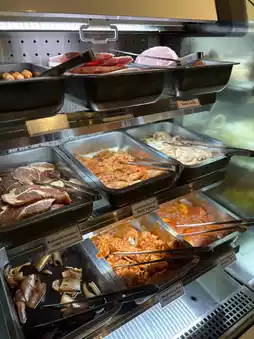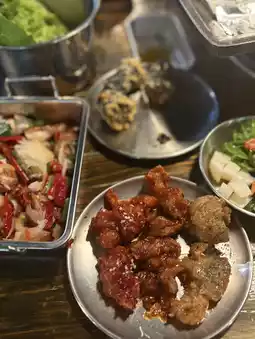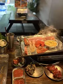 The restaurant offers a variety of dishes and has a corner where you can make kimchi soup and ramyeon yourself. For grilling, there are pork neck, pork belly, and more, including bacon and sausages, grilled hot with foil under the grill to reduce sticking and make grilling meat easier. There are also various fried chicken flavors available to order anytime.