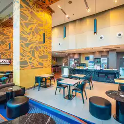 Just a few steps away, you can find something to eat or shop for brand-name goods.