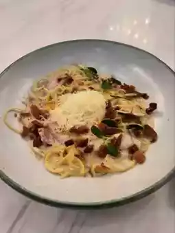 The carbonara spaghetti is creamy and smooth, perfect for those who like creamy dishes. It features a large onsen egg and delicious champignon mushrooms.