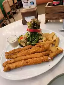 The fish and chips are long fish sticks served with tartar sauce that has a fragrant honey aroma.
