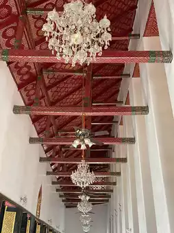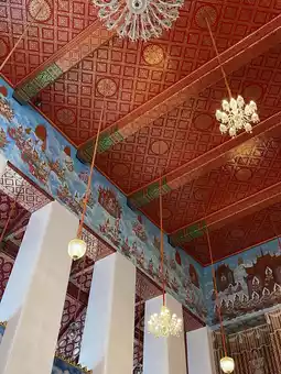 Besides the Buddha statues, the ubosot also contains other interesting features, such as mural paintings depicting the life of the Buddha on the surrounding walls. Although these murals are newly painted and not ancient works hundreds of years old, they have a unique charm. Especially notable is the depiction of angels displaying their powers using only line drawings. At first glance, one might think the artist didn’t finish the work, but it was intentional to show that these angels are manifesting their powers without revealing their forms, so ordinary people cannot see them.