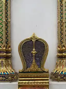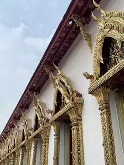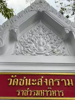 Another thing to notice is the pediment frame. In most temples, the frame has a "naga sudung" (serpent motif) that makes the frame curved. But here, it only has a "ruay raka" (decorative pattern) and omits the naga sudung, resulting in a straight frame similar to a typical house gable. This is a distinctive feature of the architectural style of the Front Palace craftsmen, found in temples or palaces built by the nobility of the Front Palace faction. This contrasts with the Royal Palace craftsmen’s architecture, which always includes the naga sudung.