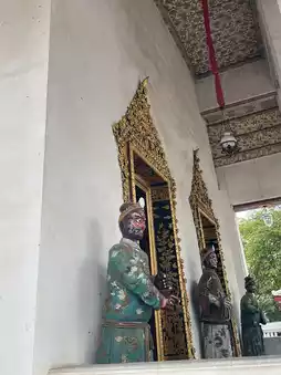 Another interesting feature before entering the ordination hall is the temple guardians. Usually, temple guardians are either carved or painted on the doors, or are stone sculptures. Here, there are two large glazed ceramic statues instead. The inner doors are painted with Chinese temple guardians called Xiao Gang, while the outer doors are decorated with mother-of-pearl inlays depicting dragons riding clouds. This is a unique use of guardians layered upon guardians.