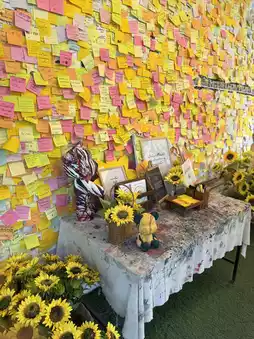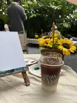 The atmosphere inside the shop is shady, with plenty of green space, along with art or artistic mess 😂 Many creative activities like drawing, painting dolls, or splattering paint in art—it's up to us to create our own masterpieces. There are also delicious food, drinks, and desserts.