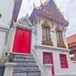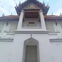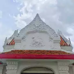 - The ordination hall is decorated entirely with marble. The building has a cruciform shape with projecting porches at the front and back. The roof is layered in five tiers, covered with yellow Kaboo tiles shaped like curved shells. The eaves are adorned with Thepphanom tiles, and a cloister surrounds the hall. The gables are decorated with chofah, bai raka, and swan tail motifs, all lacquered and gilded. The pediment is beautifully carved wood, lacquered, gilded, and inlaid with glass.
