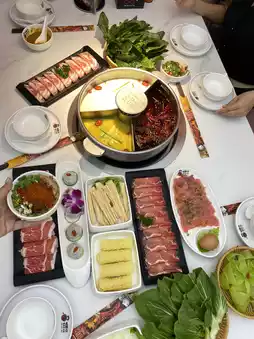 • The mala hotpot broth is rich and deeply spicy, with adjustable spice levels.